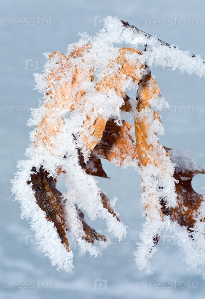 Сухие дубовые листья, покрытые инеем