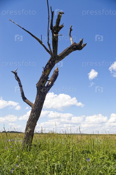 Сухое дерево на зеленом лугу