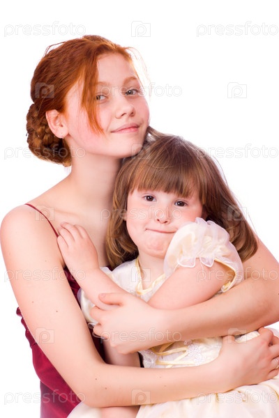 Две счастливые сестры на белом фоне
