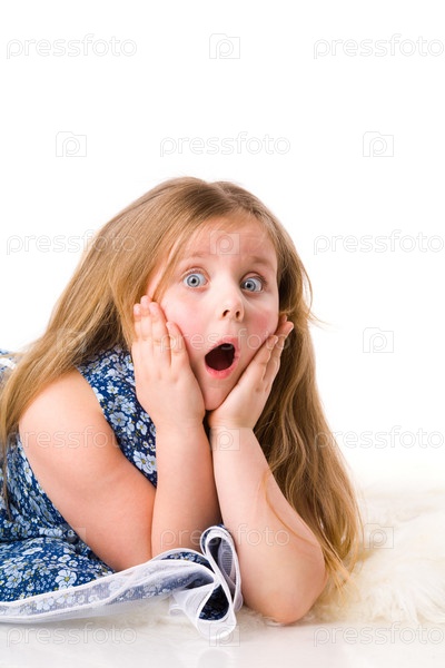 Маленькая удивленная девочка на белом фоне