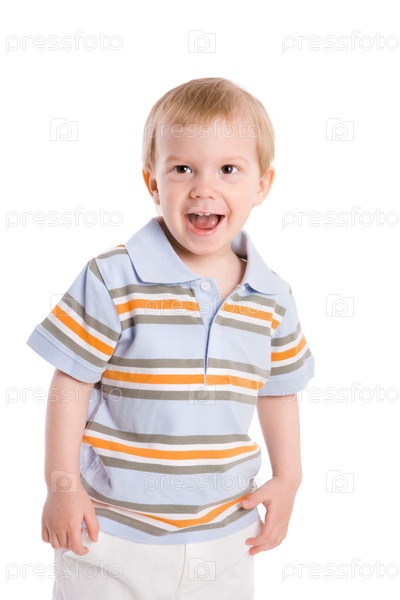 Портрет маленького смеющегося мальчика на белом фоне