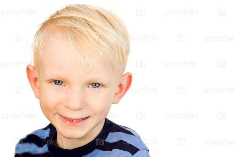 Портрет маленького улыбающегося мальчика на белом фоне