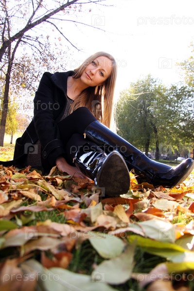 Девушка сидит на осенней земле