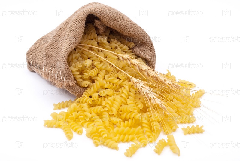 Брезентовый мешок с макаронными изделиями на белом фоне