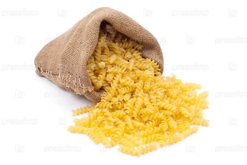 Брезентовый мешок с макаронными изделиями на белом фоне