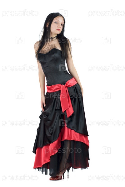 Портрет молодой девушки в красно-черном платье на белом фоне