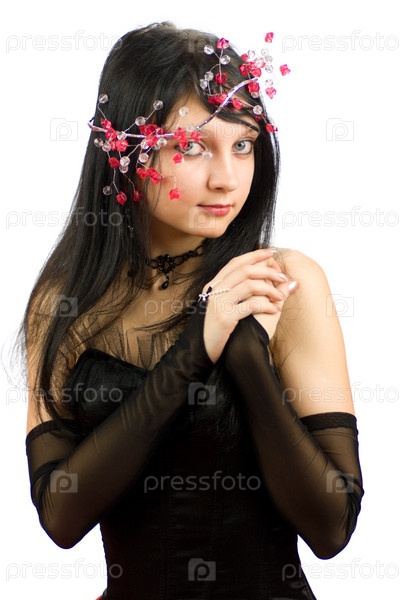 Портрет молодой девушки в черном платье на белом фоне
