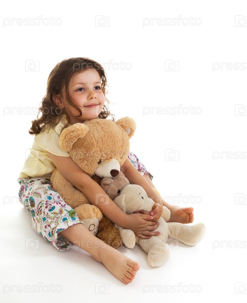 Маленькая девочка сидит на полу с плюшевыми игрушками