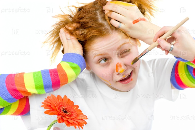 Портрет молодой рыженькой девушки, которой рисуют на лице красками
