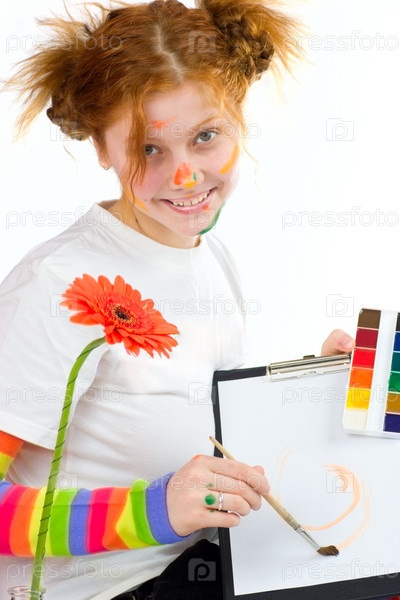 Молодая девушка со следами краски на лице, рисует на листе