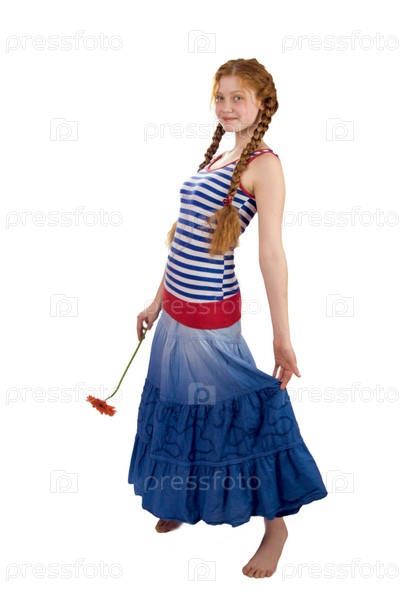 Молодая рыженькая девушка с герберой в руках на белом фоне