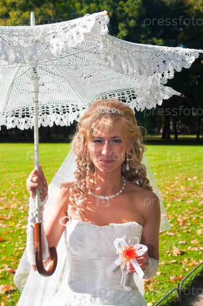 Невеста с зонтиком в парке