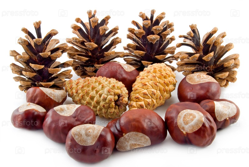 Сосновые шишки и орехи крупным планом на белом фоне