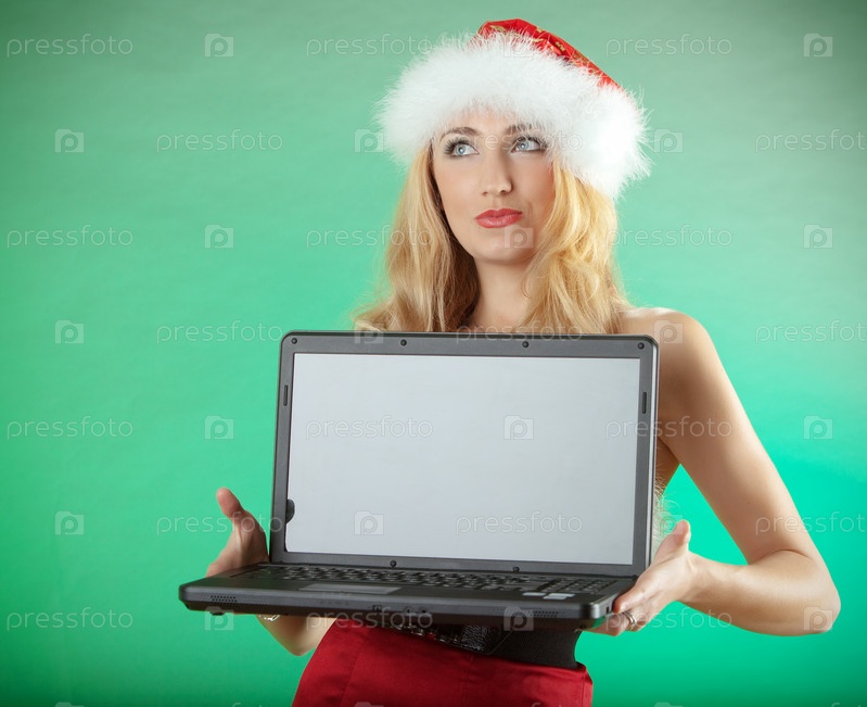 Девушка в новогодней шапке с ноутбуком