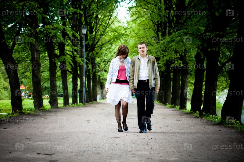 Молодая влюбленная пара прогуливается по парку