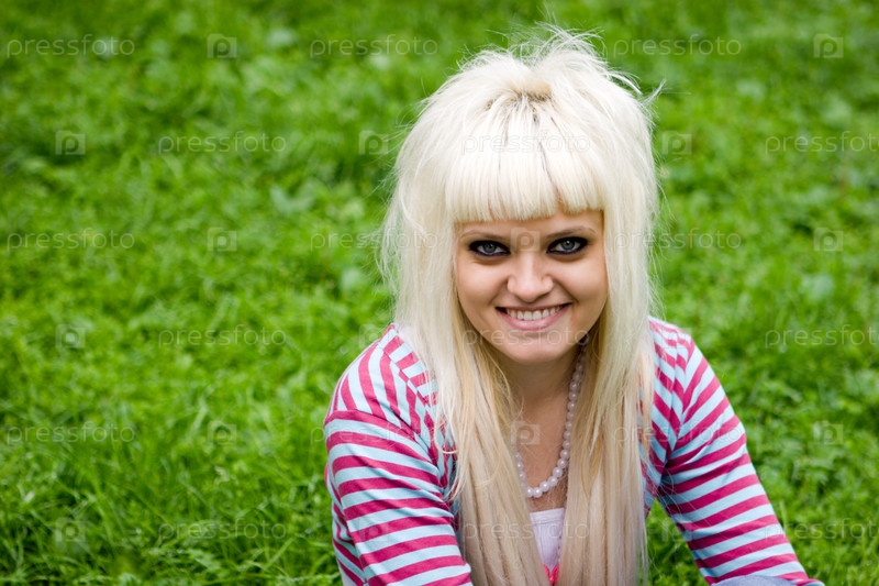 Молодая блондинка отдыхает на траве в парке