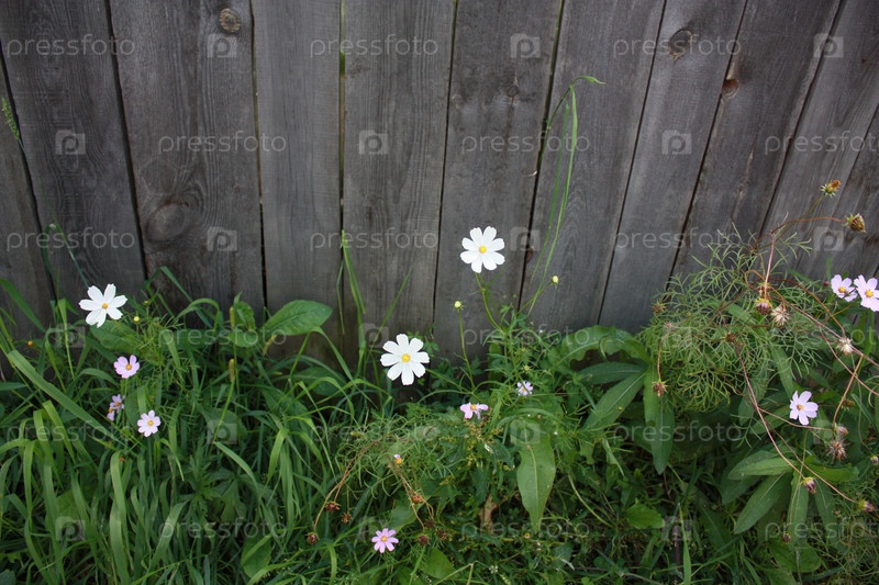 Красивые цветы космеи на фоне деревянного забора