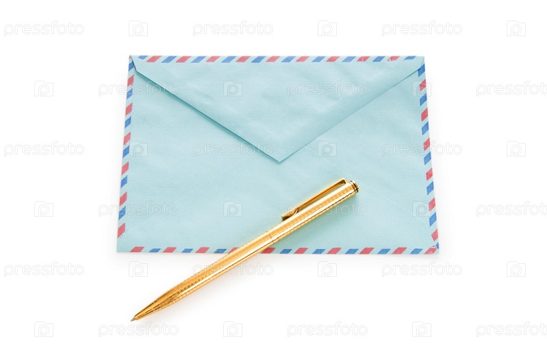 Голубой конверт с ручкой на белом фоне
