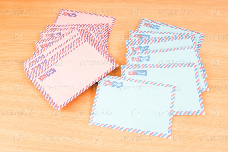 Голубые и розовые конверты на деревянном фоне