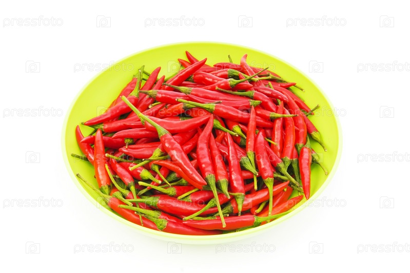 Острый перец в зеленой тарелке, изолированный на белом фоне