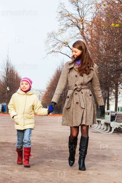 Молодая мать гуляет с красивой дочерью в парке