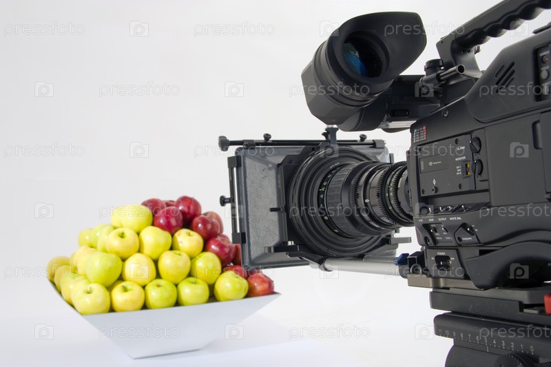 Камера снимает тарелку с яблоками на белом фоне