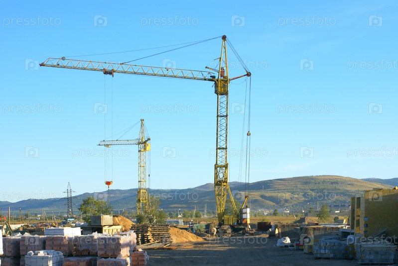 Строительная площадка с башенными кранами на фоне голубого неба