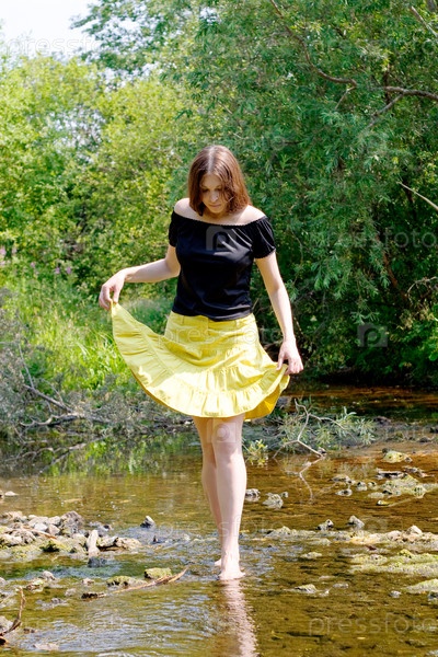Молодая женщина переходит вброд ручей в лесу