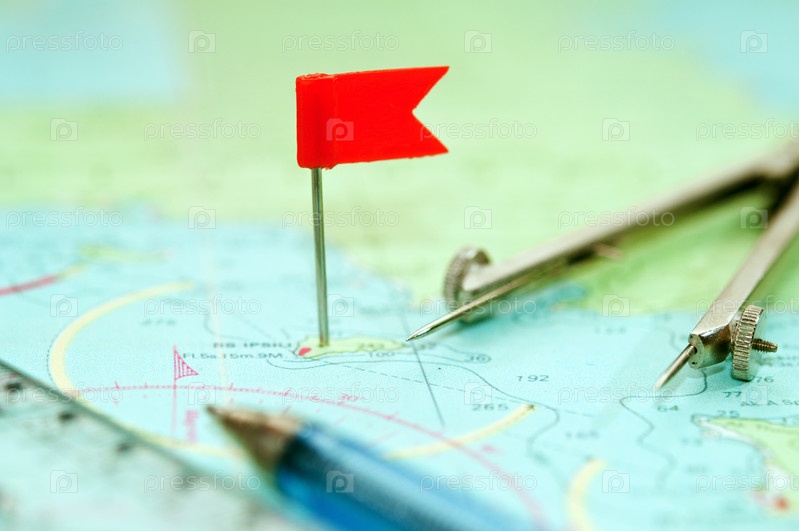 Линейка, циркуль и красный флаг на навигационной карте