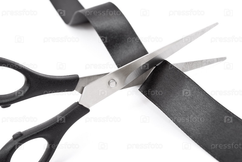 Ножницы разрезают черную ленту на белом фоне