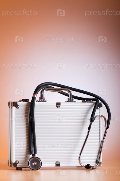 Докторский чемоданчик со стетоскопом на коричневом фоне