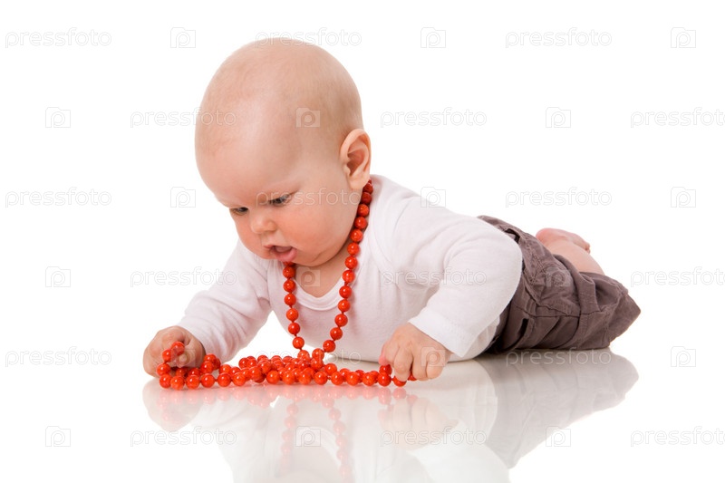 Малыш играет с бусами на белом фоне
