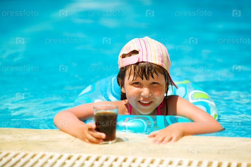 Маленькая девочка в бассейне со стаканом освежающего напитка