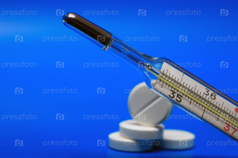 Термометр и таблетки на синем фоне