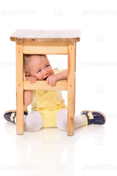 Маленький ребенок плачет под стулом на белом фоне