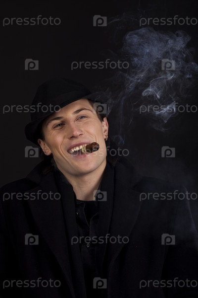 Мужчина в черной шляпе курит сигары и улыбается