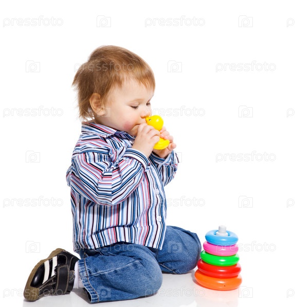 Мальчик играет с пирамидкой на белом фоне