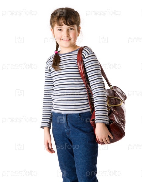 Десятилетняя девочка с коричневой сумкой на белом фоне