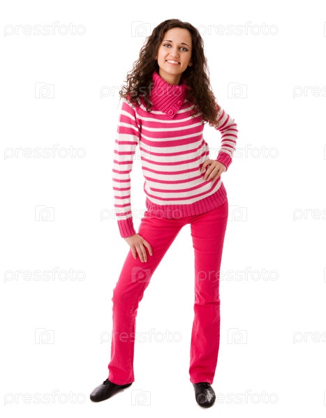 Девушка в красной одежде стоит на белом фоне