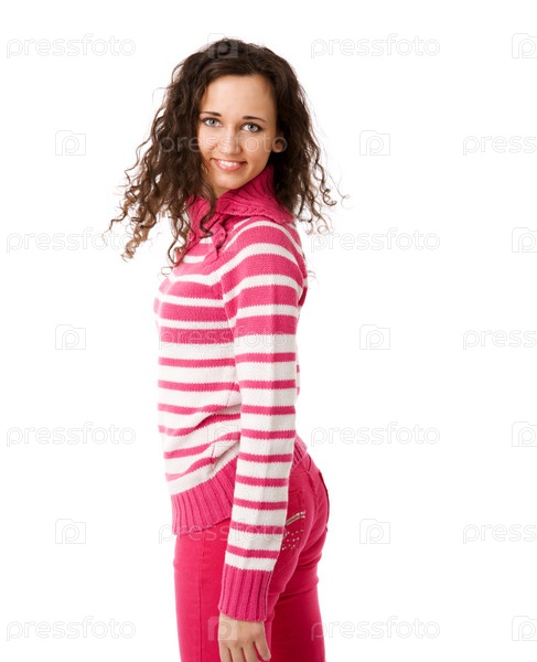Девушка в красной одежде стоит на белом фоне