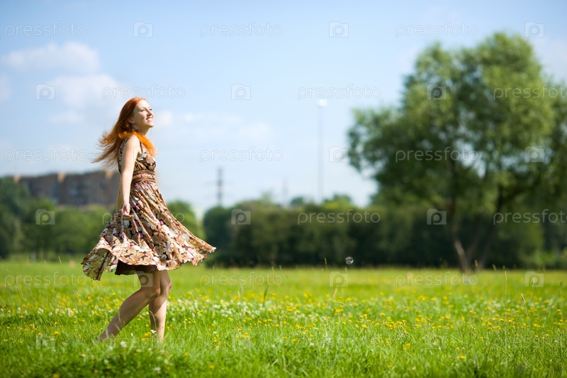 Молодая рыженькая девушка, гуляющая по летнему парку