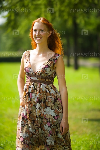 Молодая рыженькая девушка, гуляющая по летнему парку