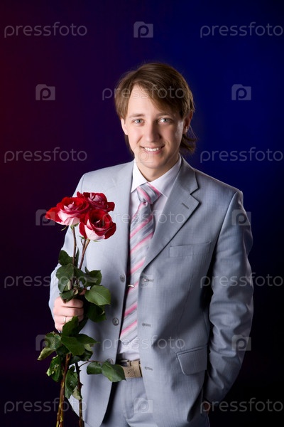 Молодой мужчина в костюме с букетом роз на темно-синем фоне