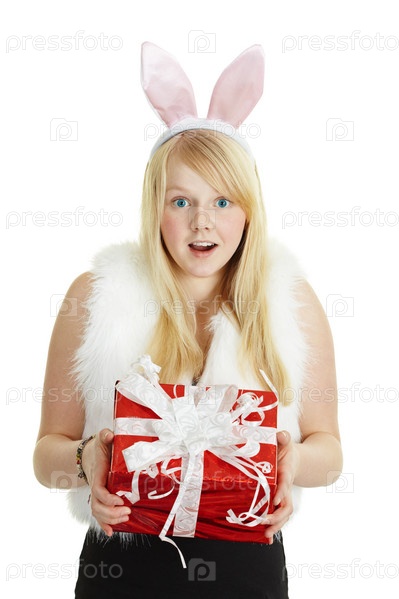 Девушка в костюме кролика с новогодним подарком