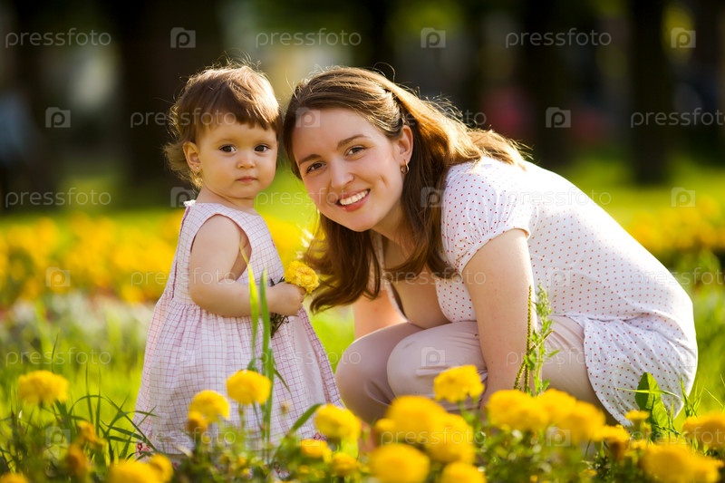 Портрет матери с дочерью на фоне желтых цветов