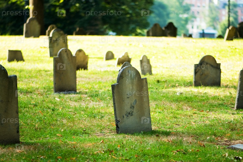 Кладбище с надгробными плитами в солнечный день