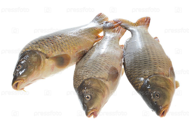 Три свежих карпа в перспективе - от головы до хвоста на белом фоне