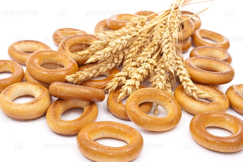 Сушки и колосья пшеницы на белом фоне
