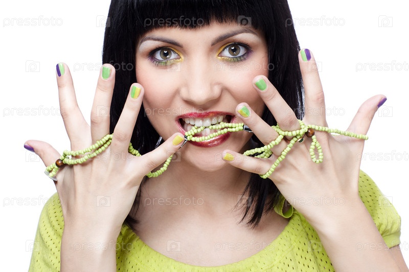 Девушка с ярким макияжем и маникюром держит в зубах бусы