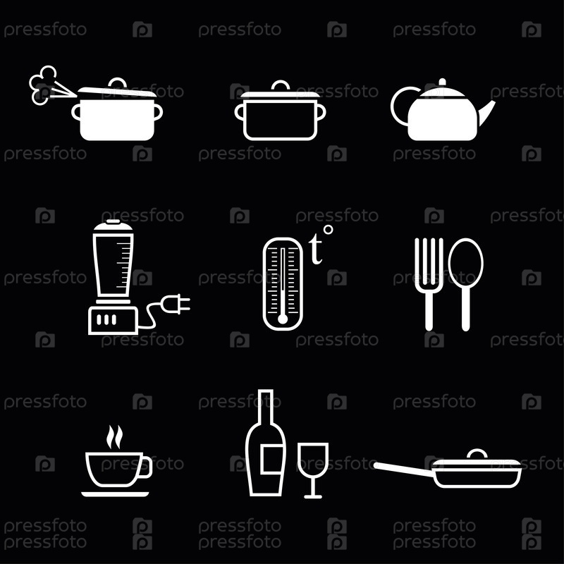 Набор векторных икон для ресторана, бара, кафе и т. д. Кухонные знаки Белое изображение (очертание) на черном фоне